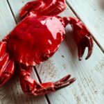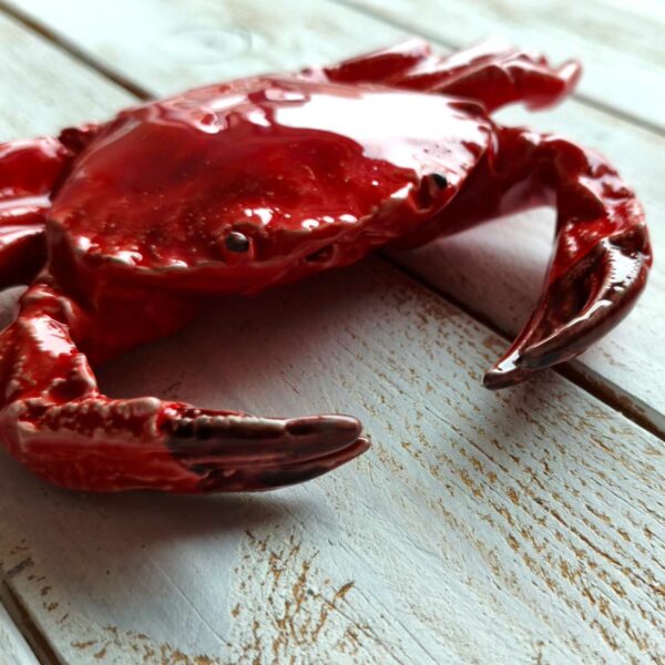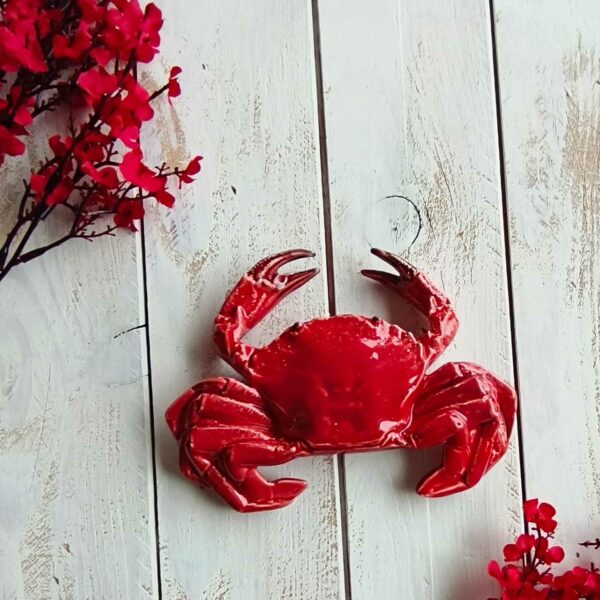 Design: Um caranguejo detalhado, pintado num vermelho vibrante e apelativo.